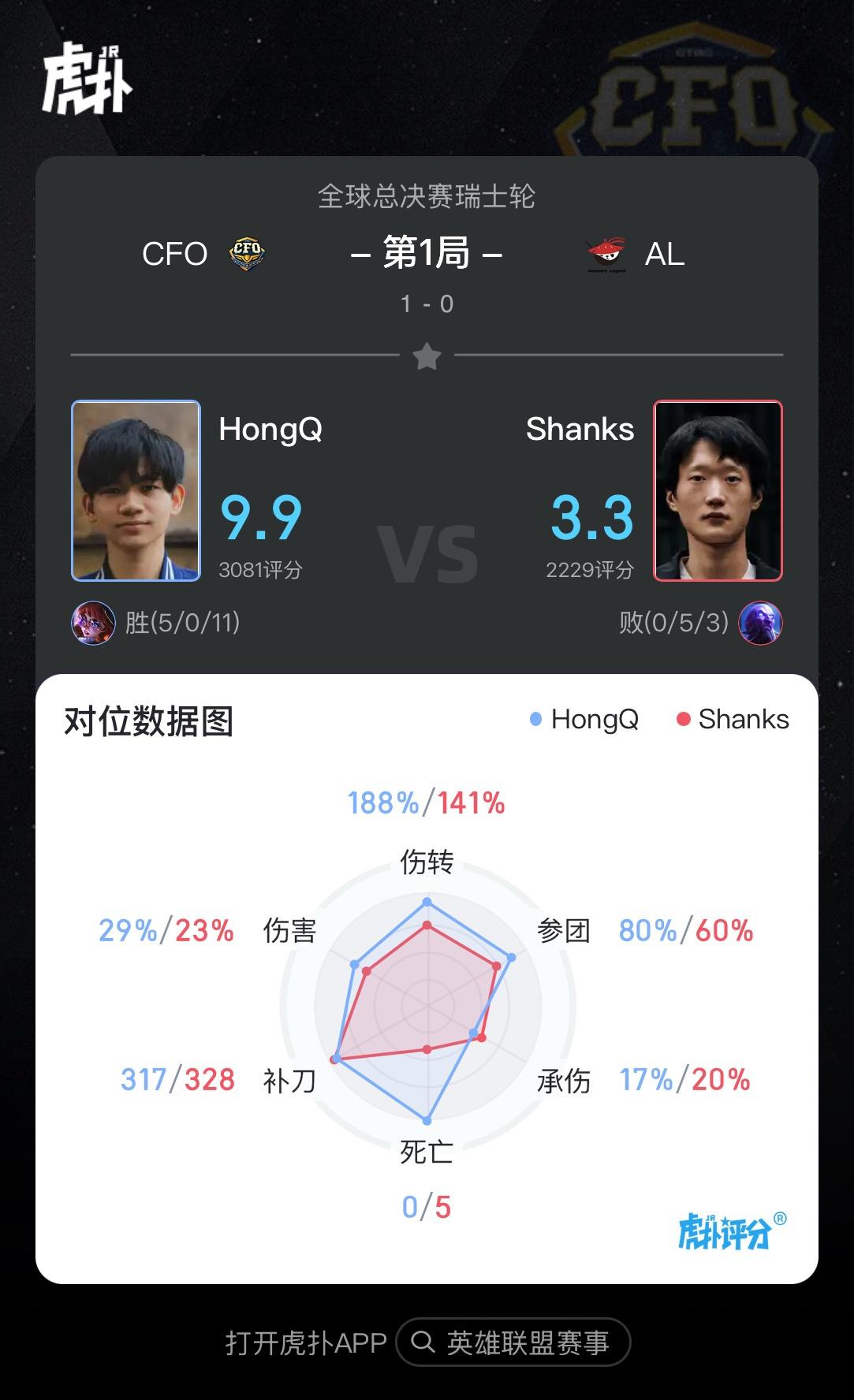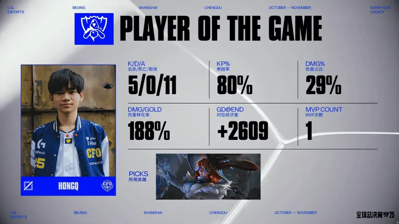 虎撲10月17日訊 在剛剛結(jié)束的S15世界賽瑞士輪CFO對陣AL比賽中,HongQ阿蘿拉打出5/0/11戰(zhàn)績,阿蘿拿下CFO對陣AL第一局MVP,出戰(zhàn)這是績拿他第1個(gè)MVP。