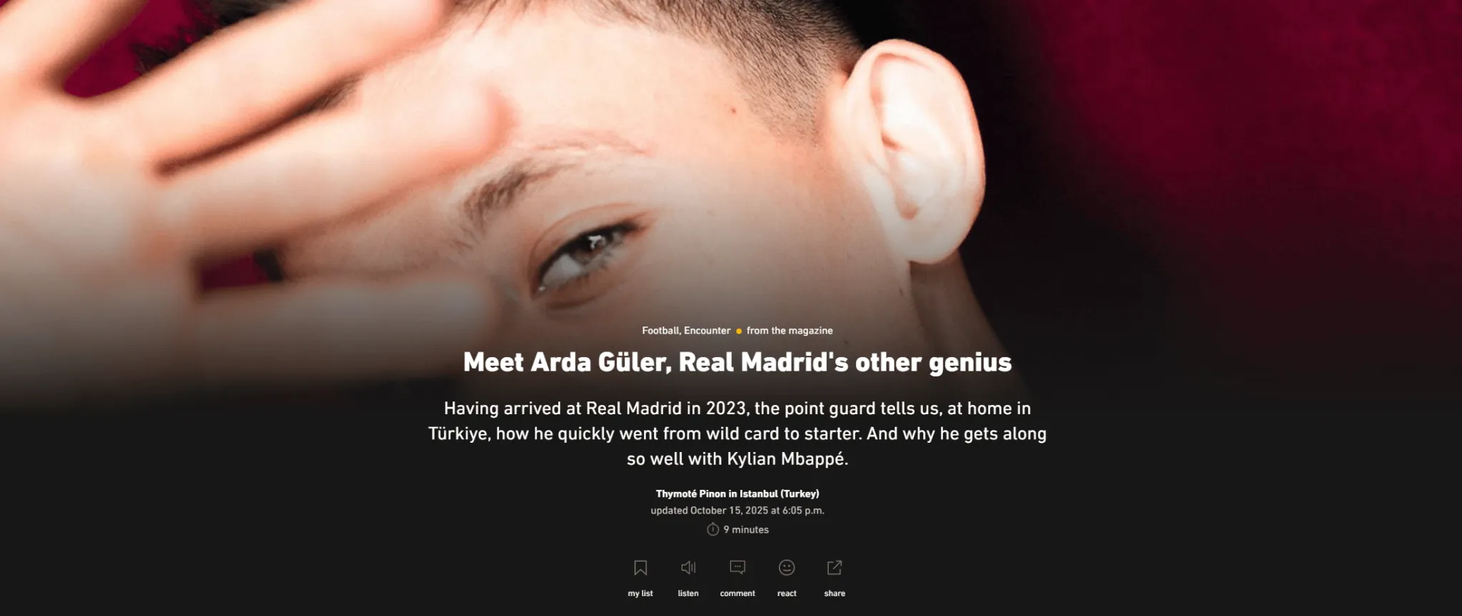 離開(kāi)伊斯坦布爾和費(fèi)內(nèi)巴切—他14歲時(shí)加入的俱樂(lè)部,那個(gè)來(lái)自安卡拉的男孩—來(lái)到馬德里,經(jīng)歷了隨之而來(lái)的一切。居勒的故事就像足球世界里偶爾會(huì)發(fā)生的那樣。