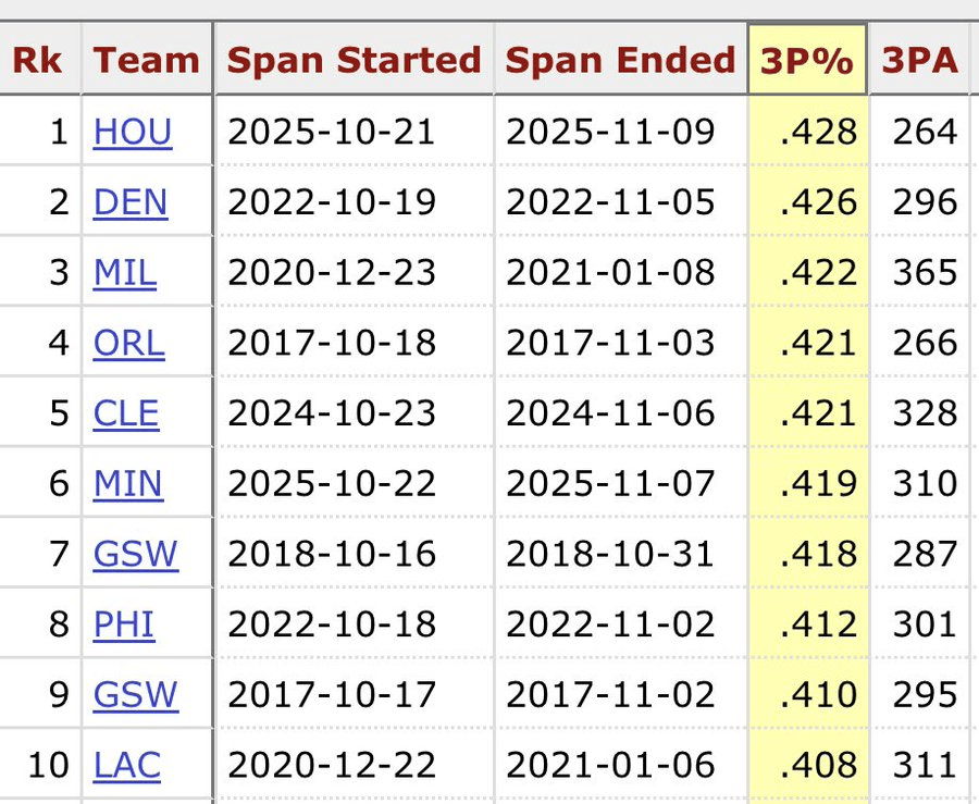 虎撲11月12日訊 今日,美媒發(fā)推分享了一則火箭的板火數(shù)據(jù)。