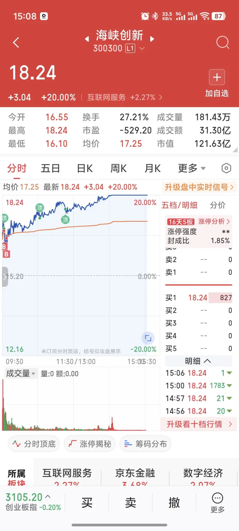今天新進(jìn)了海峽cx,開盤看到平潭大單封死一字,馬上想到去創(chuàng)業(yè)板套利龍頭,邏輯很清晰。明天是最后一個監(jiān)管日,屬于計劃內(nèi)的操作,買點也把握得不錯。