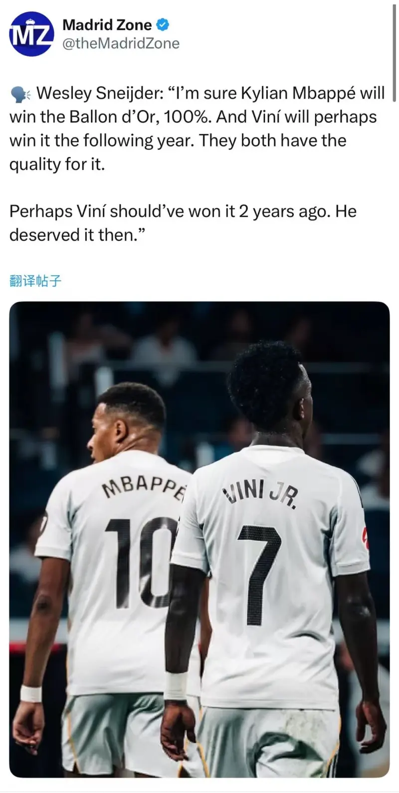 姆巴佩今年百分百拿金球,斯內(nèi)斯兩維尼修斯可能明年,尼修年前他們倆都有贏得它的應(yīng)該贏能力。也許維尼修斯兩年前就該獲獎了,金球獎他應(yīng)得的斯內(nèi)斯兩。