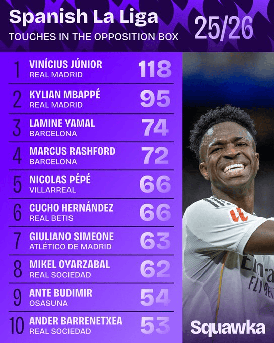 虎撲11月11日訊 Squawka統(tǒng)計(jì)截至目前西甲本賽季禁區(qū)觸球次數(shù)排名。