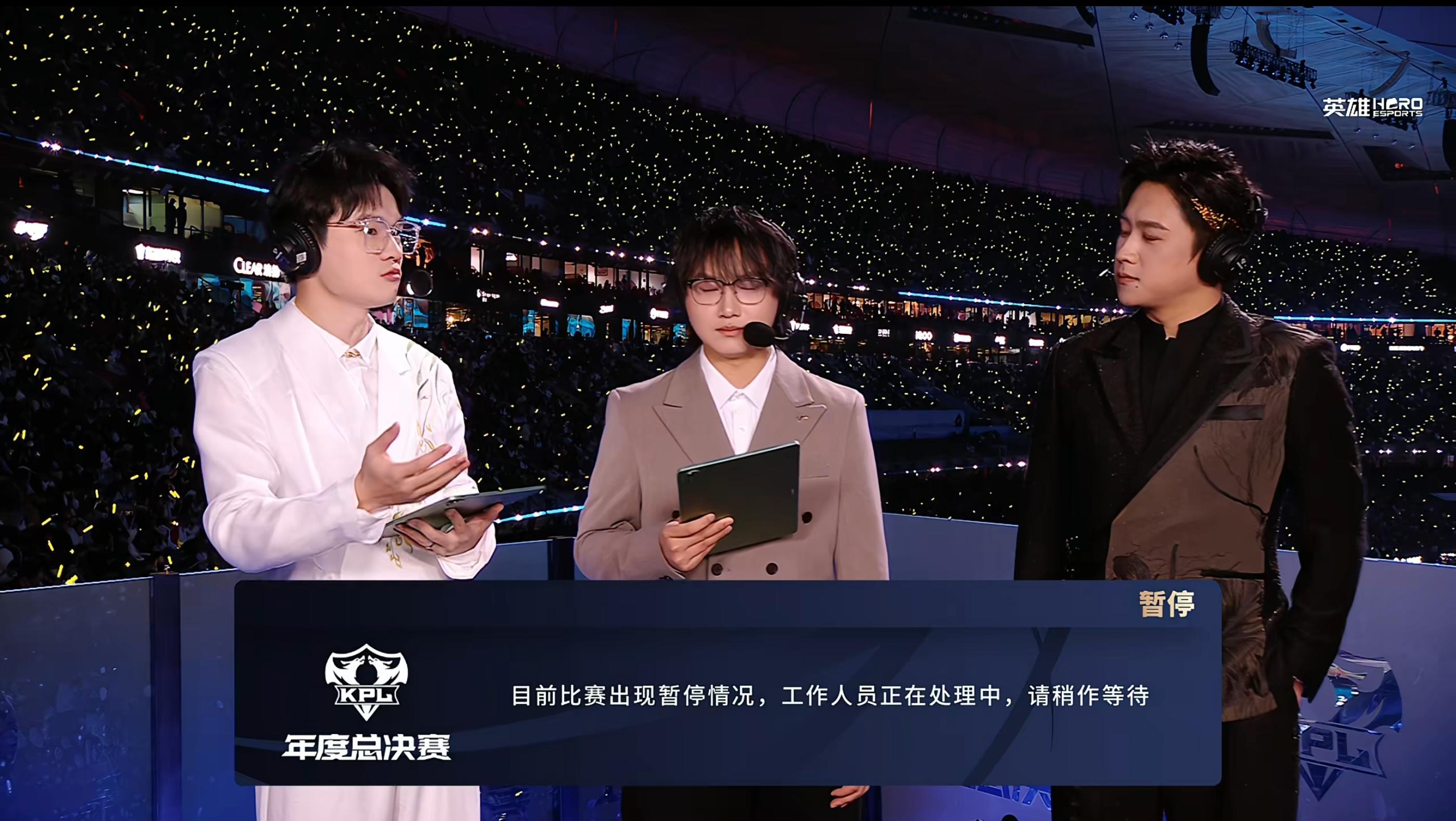 虎撲11月08日訊 2025KPL年度總決賽決賽第1局比賽中,目前比賽出現(xiàn)暫停情況,現(xiàn)暫工作人員正在處理中,停情請稍作等待。況工