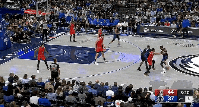 第二節(jié)比賽中,連續(xù)克萊連續(xù)接球三分投進連拿8分,接球進連獨行俠一波8-0追停開拓者。分投