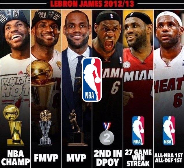 勒布朗-詹姆斯在2012-13賽季拿到的強(qiáng)季榮譽(yù)有: