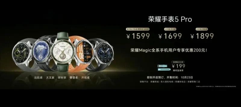 共帶來(lái)了開(kāi)拓者、攀登者、探秘家、天文家、遠(yuǎn)航者等多款配色。整體外觀延續(xù)了榮耀高端智能穿戴系列的設(shè)計(jì)語(yǔ)言,質(zhì)感與運(yùn)動(dòng)風(fēng)格兼?zhèn)?。該產(chǎn)品被稱(chēng)為「榮耀最強(qiáng)健康監(jiān)測(cè)智能手表」,在健康功能上實(shí)現(xiàn)了大幅進(jìn)化。除支持 心率、壓力、睡眠監(jiān)測(cè) 等常規(guī)功能外,還新增了睡眠呼吸暫停檢測(cè)、心電圖(ECG)、脈搏波房顫與早搏提示等專(zhuān)業(yè)級(jí)健康檢測(cè)能力。手表采用全新的分布式光學(xué)結(jié)構(gòu)與智能調(diào)光設(shè)計(jì),可根據(jù)不同膚色和環(huán)境光自動(dòng)調(diào)整監(jiān)測(cè)光強(qiáng),以提升健康數(shù)據(jù)捕捉的精準(zhǔn)度。值得關(guān)注的是,它支持無(wú)感血壓監(jiān)測(cè)功能,用戶(hù)可隨時(shí)記錄血壓數(shù)據(jù),并獲得非藥物控壓建議。此外,手表還具備血壓測(cè)量與全天候血壓監(jiān)測(cè)功能,并支持 AI 專(zhuān)業(yè)跑步指導(dǎo),為健康管理和運(yùn)動(dòng)訓(xùn)練提供全方位的數(shù)據(jù)支持。