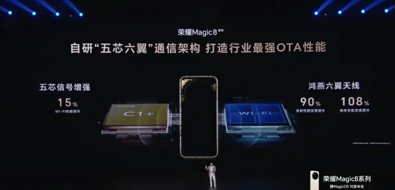 性能與系統(tǒng):Magic8 系列首發(fā)搭載第五代驍龍 8 至尊版(Elite Gen5)芯片,并輔以榮耀自研的 “五芯六翼通信架構(gòu)”,提升信號(hào)強(qiáng)度與穩(wěn)定性,支持 24 個(gè) 5G 頻段、覆蓋全球 200+ 國(guó)家 / 地區(qū)。該系列還提供 16GB+1TB 大存儲(chǔ)版本,并支持 16GB 智慧運(yùn)存拓展。