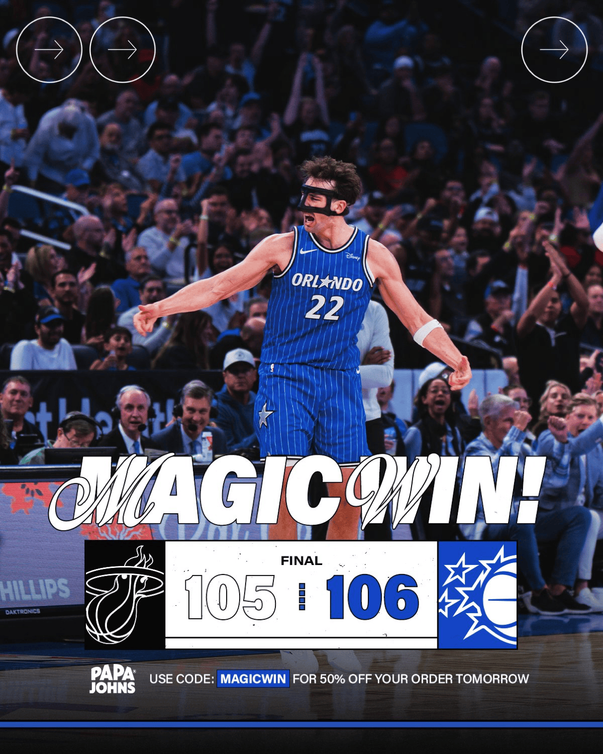 [流言板]險勝熱火!魔術(shù)官媒曬本場比賽的終場海報:魔術(shù)贏啦
