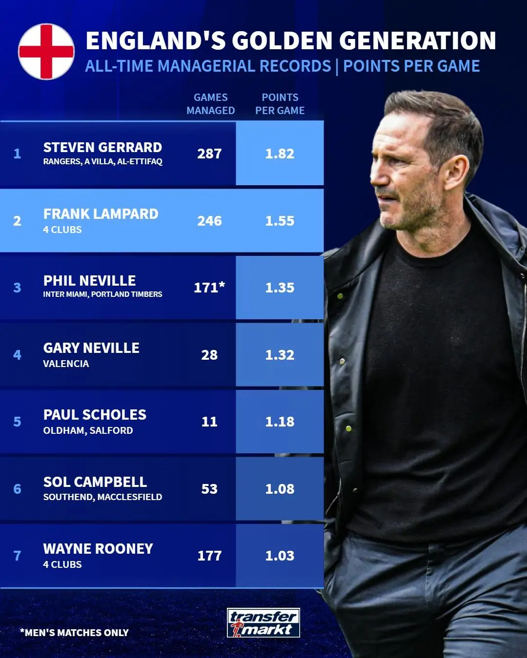 虎撲11月16日訊 德國轉(zhuǎn)會市場統(tǒng)計(jì)了英格蘭黃金一代成為教練后的場均積分,詳情如下: