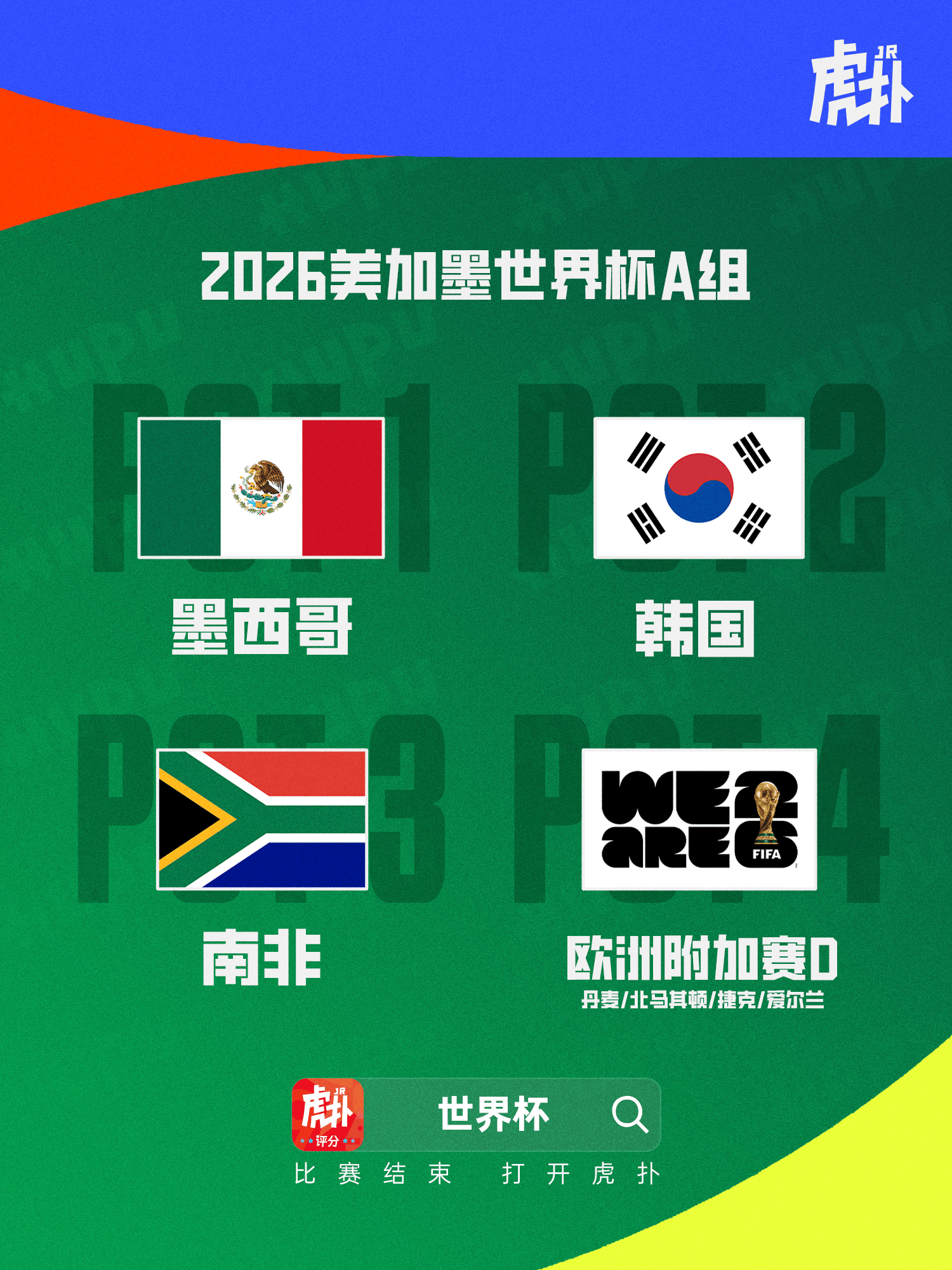 虎撲12月06日訊 2026美加墨世界杯分組抽簽儀式在華盛頓進行。A組的非和附加4支球隊為墨西哥、日本、歐洲挪威和歐洲附加賽D組勝者