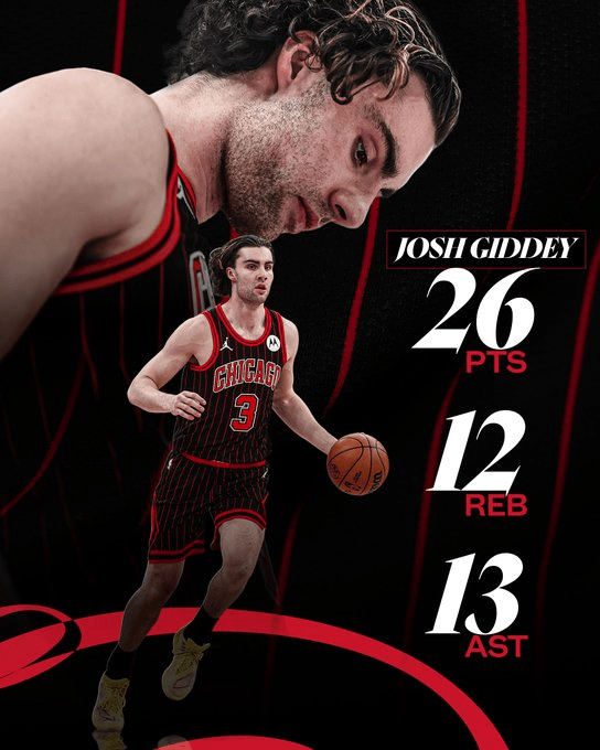 賽后,公牛官方發(fā)布吉迪數(shù)據(jù)海報,并配文道:“吉迪拿下了本賽季個人第3次三雙數(shù)據(jù)。”