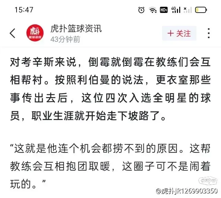 其實(shí),虎撲已經(jīng)轉(zhuǎn)載過好幾次NBA記者或球隊(duì)管理人員關(guān)于聯(lián)盟選用球員的一個潛規(guī)則,即,對于那些曾經(jīng)跟教練或球隊(duì)發(fā)生過較嚴(yán)重的矛盾的球員,整個聯(lián)盟都會集體抵制,這是管理層和教練們?yōu)榫S護(hù)自己尊嚴(yán)和權(quán)威甚至生存狀態(tài)的必然選擇。