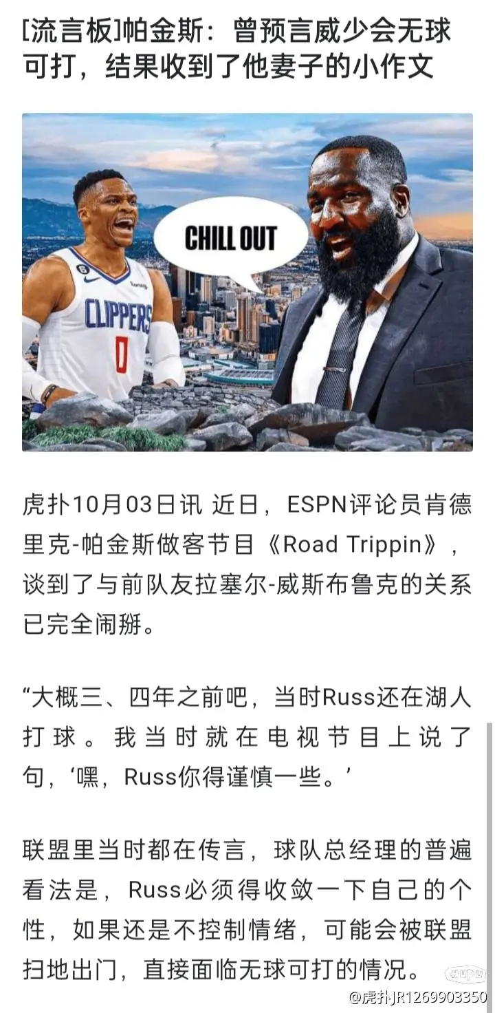 威少在湖人就不用說了,第一賽季整個賽季跟教練關(guān)系都是緊張的,第二賽季做替補(bǔ)也不是心甘情愿的。在快船,后來也傳出曾經(jīng)不滿教練不給他更多上場時間。在掘金,賽季末傳出教練與總經(jīng)理矛盾激化被雙雙解雇就是源于對他的使用,威少跳出合同并取關(guān)掘金,顯然也與此直接相關(guān)。
