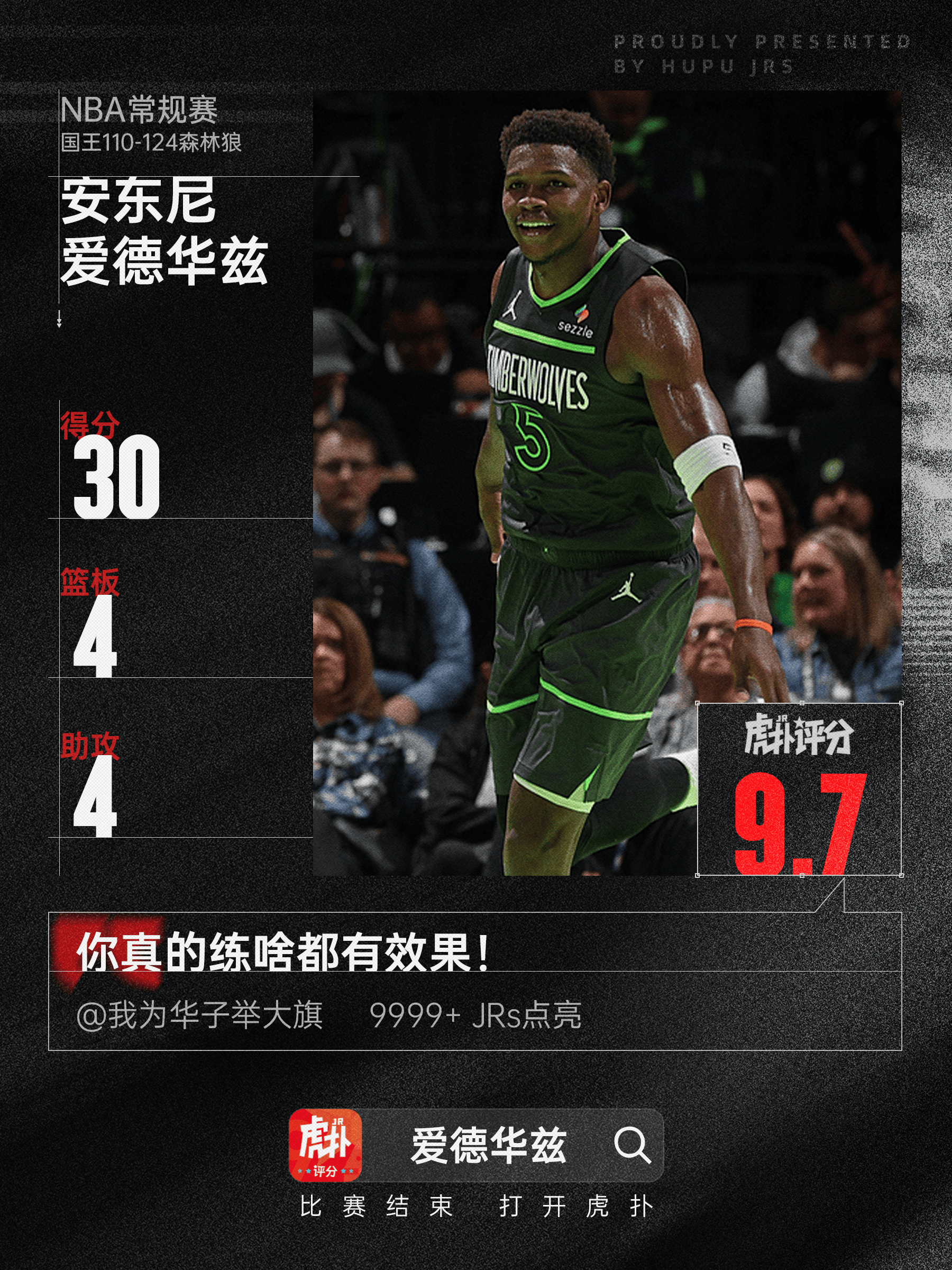 本場比賽,全場森林狼球員安東尼-愛德華茲出戰(zhàn)35分鐘,砍下20投9中,分籃其中三分球7投1中,攻搶罰球12投11中,表現(xiàn)板助得到30分4籃板4助攻2搶斷。亮眼