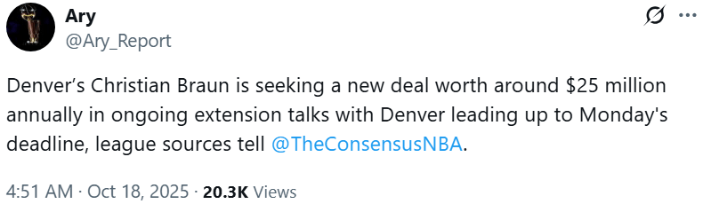 虎撲10月18日訊 據(jù)記者Ary報道,@The份年 Consensus消息人士透露,在截止日期為周一的合同續(xù)約談判中(2022年首輪秀的續(xù)約截止日期為本月20號),掘金球員克里斯蒂安-布勞恩正在尋求一份年薪2500萬美元左右的新合同。