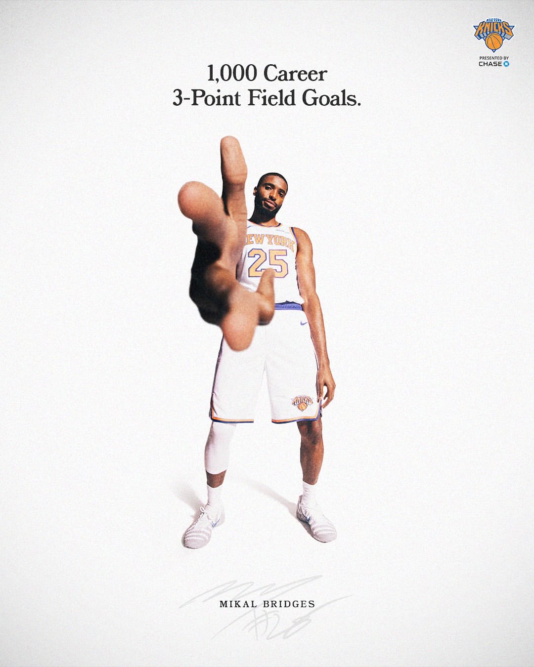 尼克斯官方賽后曬出布里奇斯生涯1000記三分海報:準(zhǔn)備好跳舞慶祝吧。