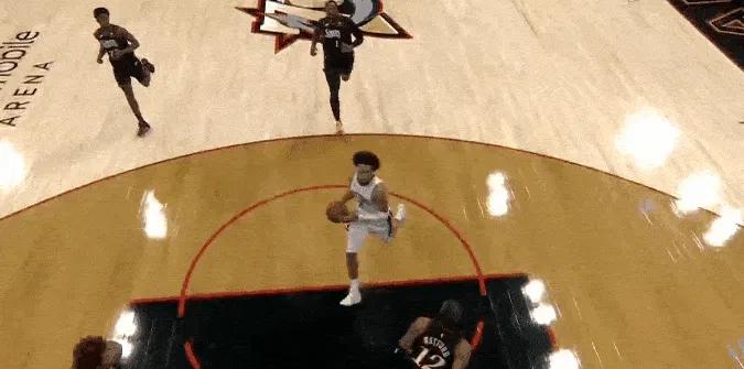 第三節(jié)比賽中,打成坎寧安迎著兩人補(bǔ)防,不難不進(jìn)高難度拉桿上籃打成2+1??矊?/p>安迎