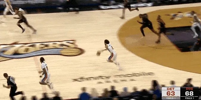 NBA常規(guī)賽,76人對陣活塞的上籃比賽正在進(jìn)行中。
