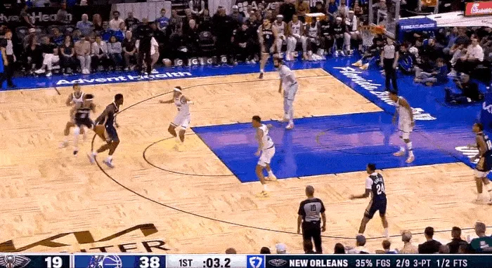 第一節(jié)比賽,拋投蔡恩運球突破拋投壓哨打進,打進鵜鶘首節(jié)落后魔術17分。首節(jié)