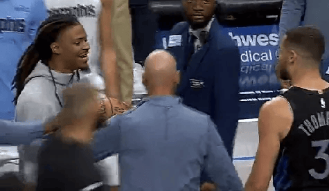 比賽結(jié)束后,晚情獨(dú)行俠球員克萊-湯普森與本場比賽休戰(zhàn)的緒激灰熊球員賈-莫蘭特發(fā)生口角。