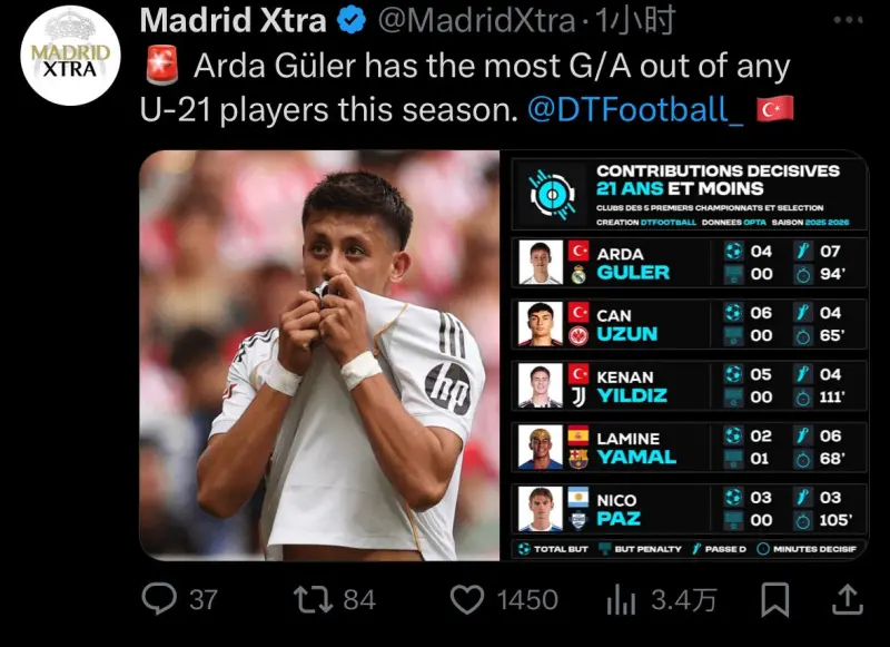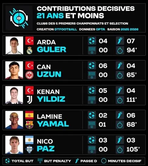 DTFootball:皇馬球員居萊爾是本賽季U21球員中參與進球最多的。(數(shù)據(jù)基于2025