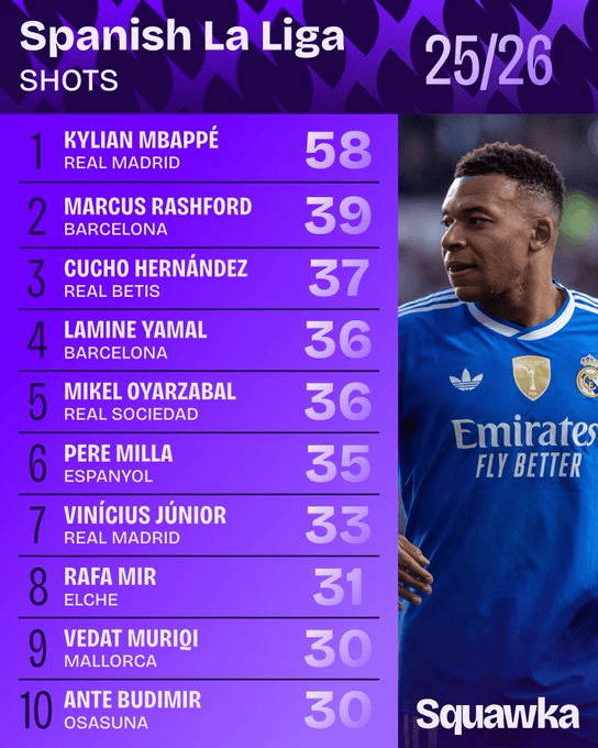 西甲本賽季射門次數(shù)榜: