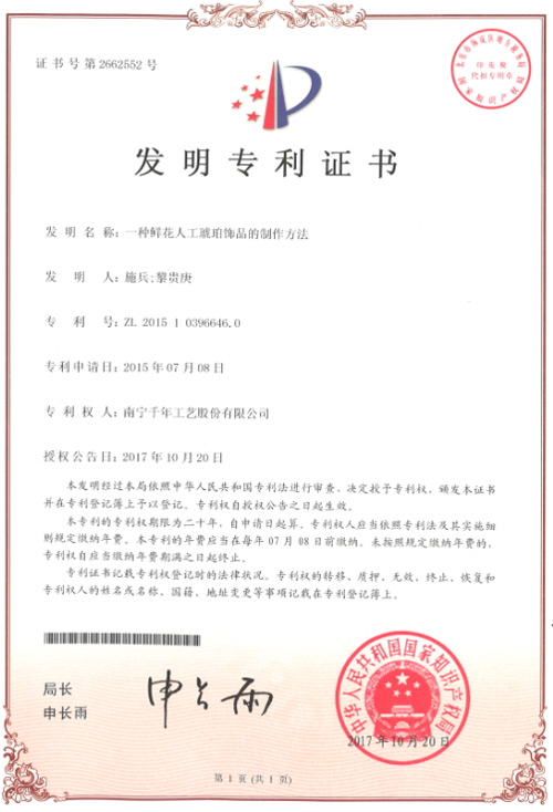 《一種鮮花人工琥珀飾品的制作方法》該發(fā)明提供一種鮮花人工琥珀飾品的制作方法,千年工藝生產(chǎn)的“千帆”品牌包埋標本采用該發(fā)明的技術方案,使得鮮花在凍干之后仍然保持原有的顏色和形態(tài),樹脂包埋之后花朵仍然保持原有的顏色和形態(tài),且包埋制得的標本在使用過程中,花朵也不隨著光線照射而變黃或褪色。