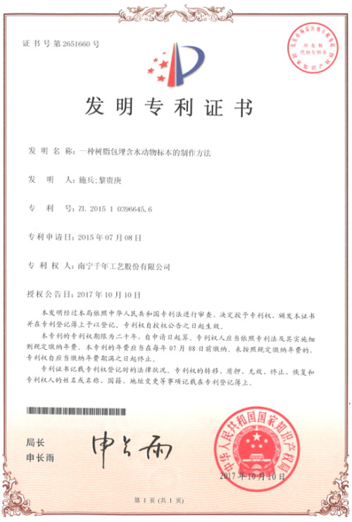 《一種樹脂包埋含水動物標本的制作方法》該發(fā)明提供了一種樹脂包埋含水動物標本的制作方法。千年工藝生產(chǎn)的“千帆”品牌包埋標本采用該發(fā)明的技術方案,使得包埋在樹脂中的標本形態(tài)顏色逼真,標本表面沒有起霧等質(zhì)量問題;包埋樹脂沒有起霧,渾濁現(xiàn)象;樹脂透明度高,能夠清晰觀察到標本各個細節(jié);長時間使用,樹脂不變黃,標本不腐敗。