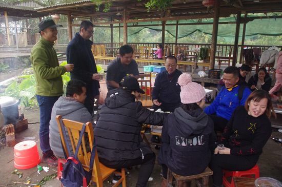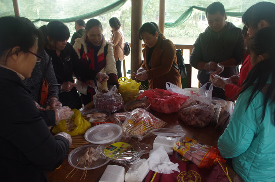10:30分,我們正式抵達(dá)目的地“竹泉島山莊”,大家紛紛參與到午餐的準(zhǔn)備活動(dòng)中,生火、穿菜、刷油、配料、烤串……,大家紛紛施展各自拿手絕活,忙得不亦樂(lè)乎,不一會(huì)大家親手烤制的肉串就飄出陣陣誘人的香氣。太陽(yáng)很應(yīng)景在此刻從云層中鉆出,金色的光芒透過(guò)樹蔭照在每個(gè)朝氣蓬勃的笑臉上。