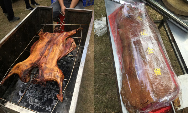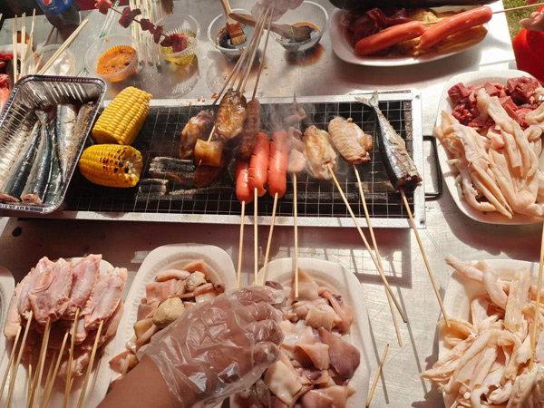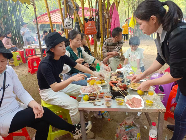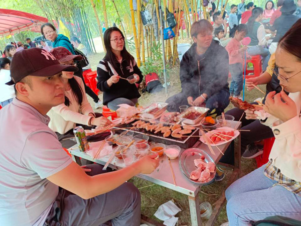 11:30體育運動結(jié)束后,大家來到燒烤場進行自助燒烤。燒烤場座落在綠蔭濃濃的竹林中,雖是冬日,卻煦日暖暖,溫和的陽光打在竹葉上,落下斑駁的日影,清風襲來,沁人心肺。燒烤場里飄香四溢的烤全羊、外酥里嫩的烤香豬、肥肥的雞腿、嫩嫩的雞翅、勁頭十足的牛肉丸,還有火腿、茄子、玉米、青椒等早已備好,此時大家早已饑腸轆轆,便迫不急待地動起手來,“自力更生”,喂飽自己的肚子! 大家團坐在烤爐旁,你遞個調(diào)料,我刷下辣醬,互幫互助,默契盡在不言中,其實,這也是一種心靈的溝通與交流。