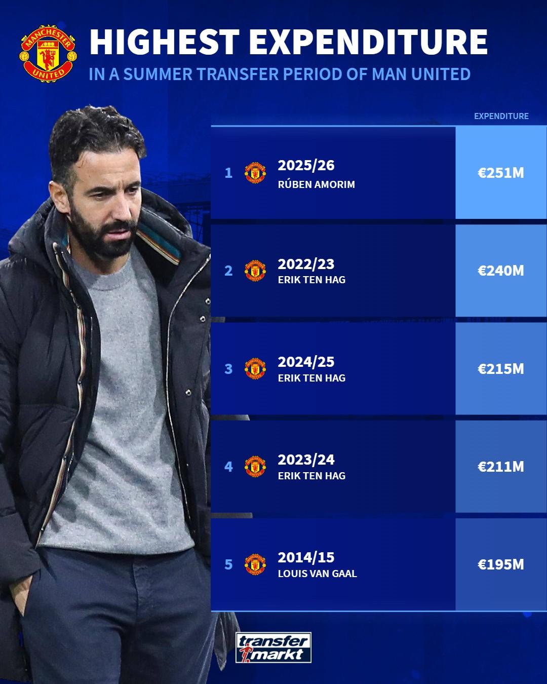 虎撲09月15日訊 德轉(zhuǎn)今日盤點(diǎn)曼聯(lián)隊(duì)史夏窗轉(zhuǎn)會(huì)支出榜,其中今年夏窗的曼聯(lián)曼聯(lián)以2.51億歐居首。